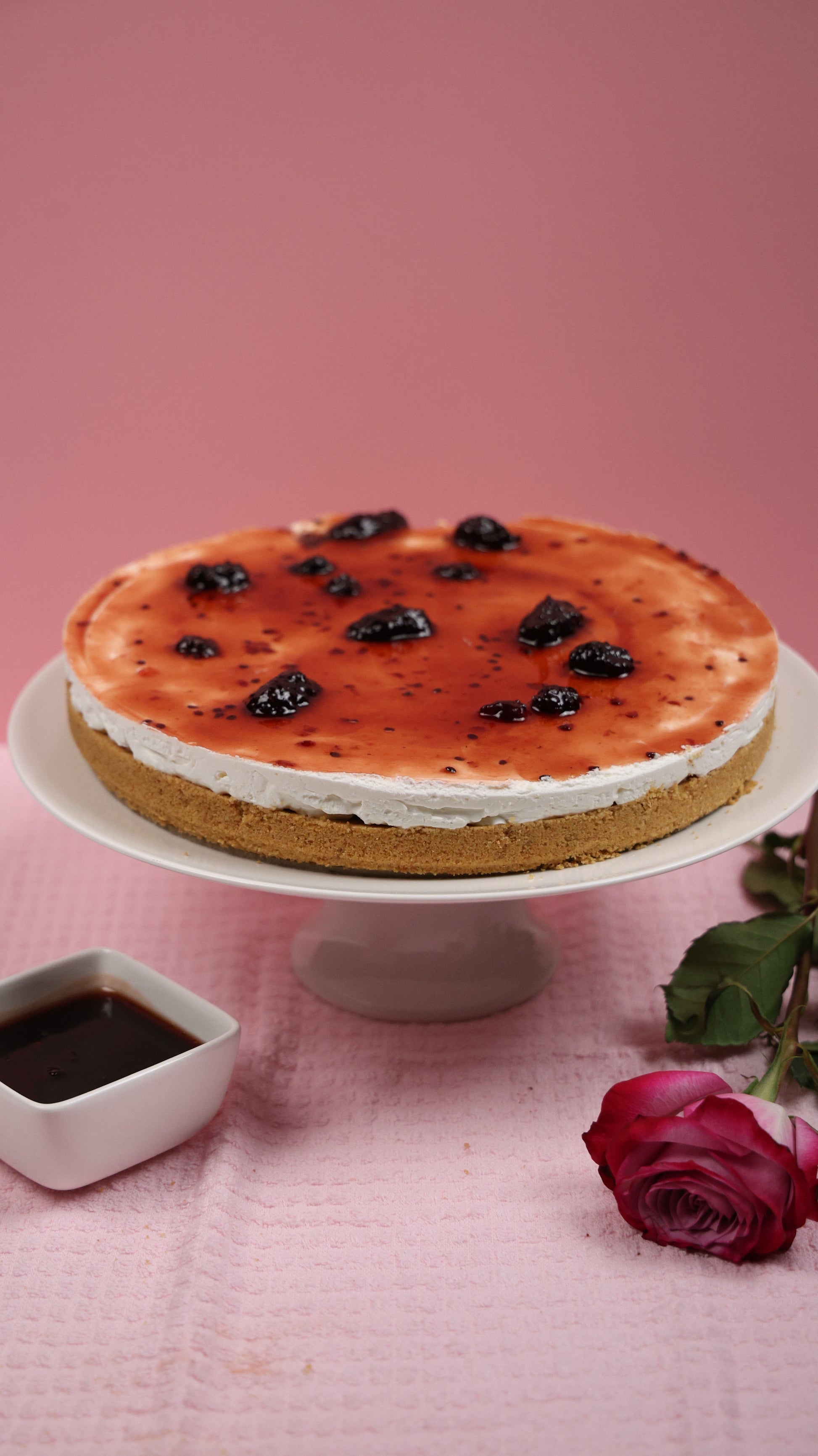 Smooth, creamy, and delicately vibrant — our Blackberry Cheesecake is a perfect balance of richness and freshness. A buttery biscuit base is topped with a silky cheesecake filling, finished with a layer of gently tart blackberry that adds brightness to every bite. The natural fruit flavor cuts through the creaminess, creating a dessert that is indulgent yet light and refreshing.